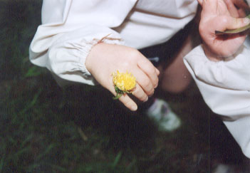 宝物 黄色い葉っぱが風に揺られてる 。 光が裏側から差し込んで葉っぱが輝いている。 とっても綺麗。 アッ、落ちた。 今日の宝物だね。 |